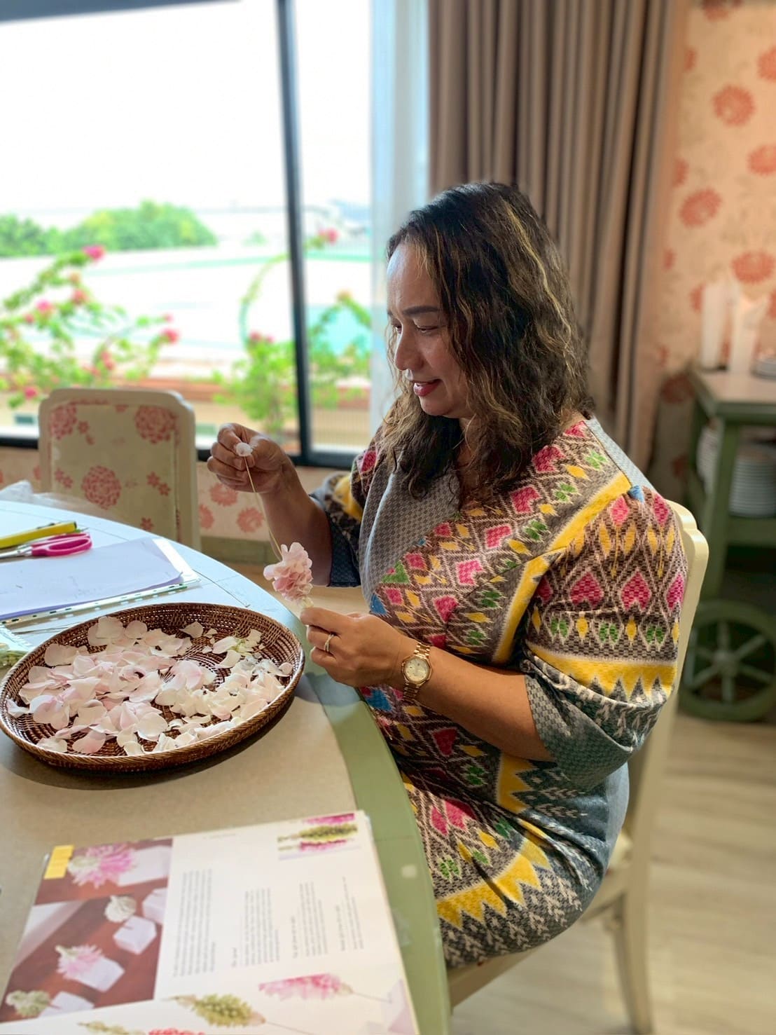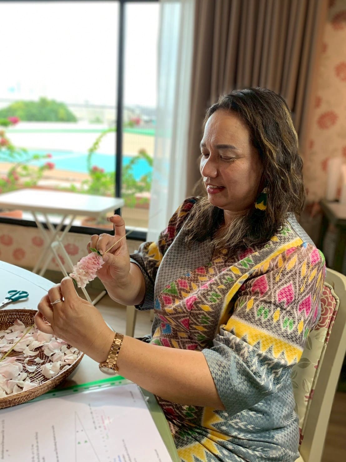 คลาสนี้จะเรียนร้อยมาลัยตุ้มก่อน เพื่อให้คุ้นเคยกับทักษะการส่งกลีบที่ไม่เท่ากัน และฝึกการร้อยมาลัยกับทาง มะพร้าว เรียนการอ่านผังลาย เพื่อร้อยมาลัยกระแต