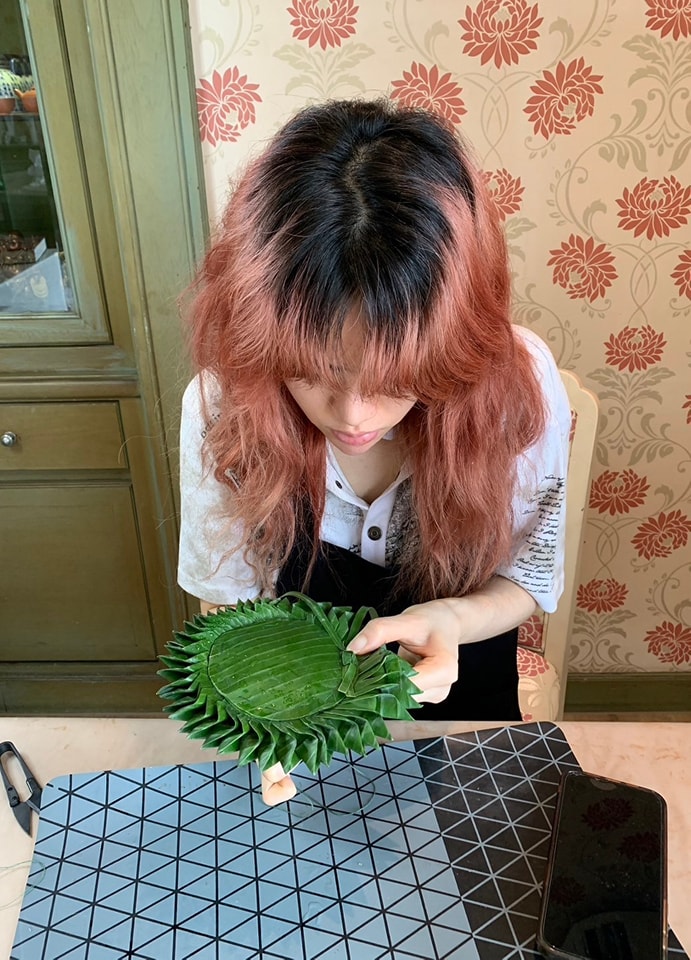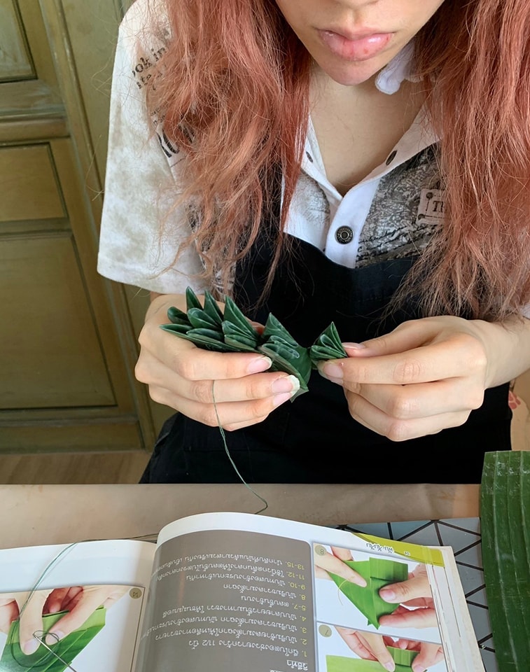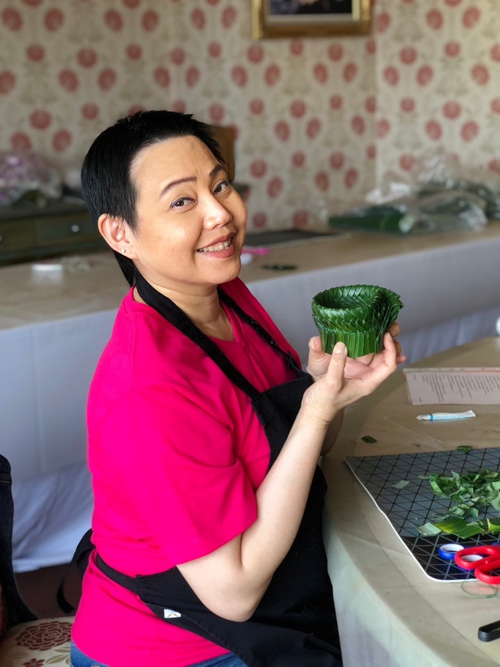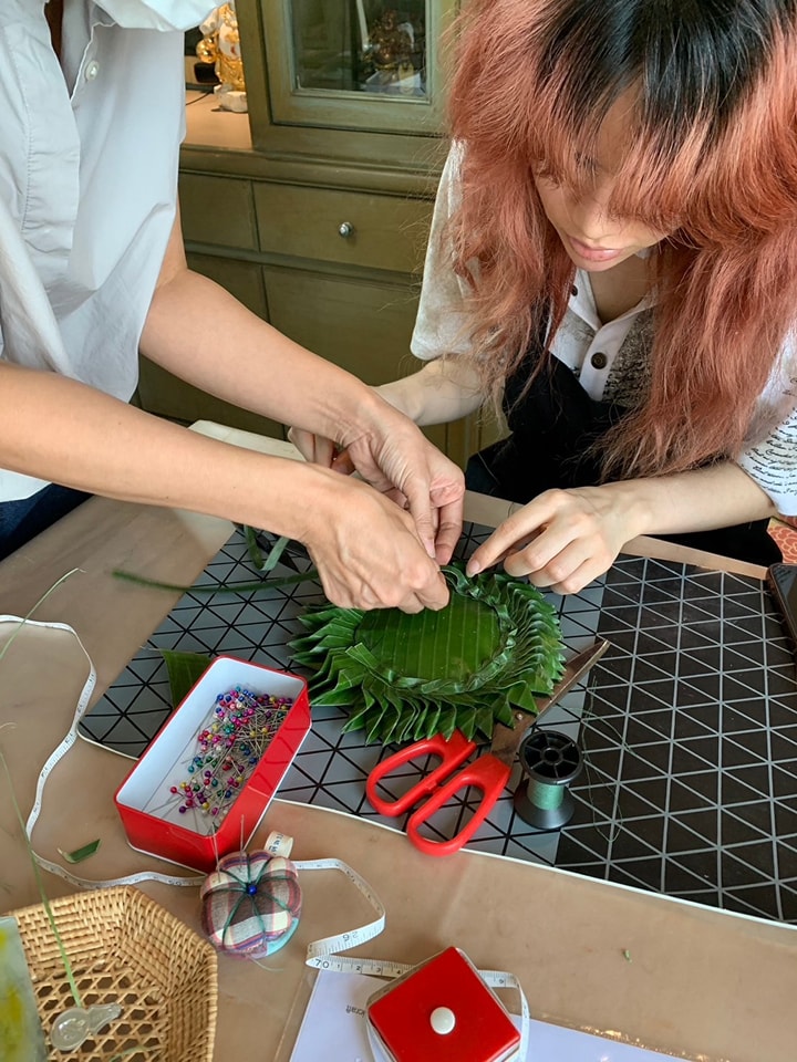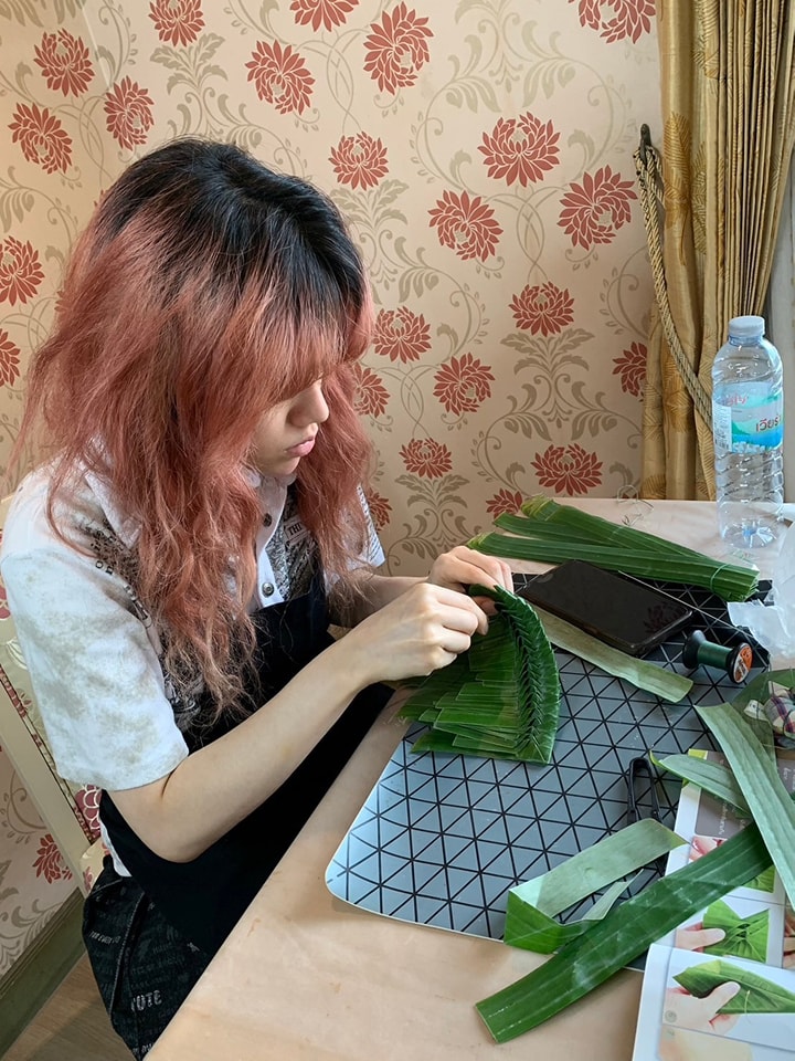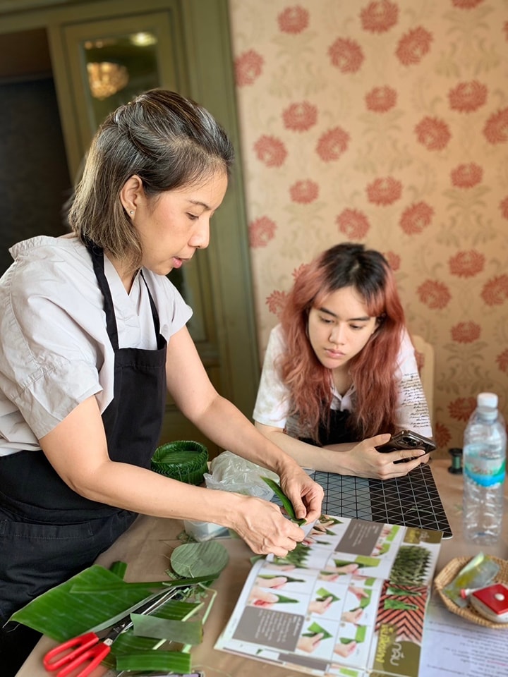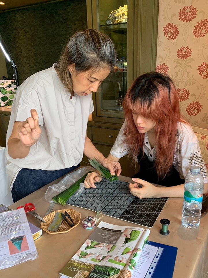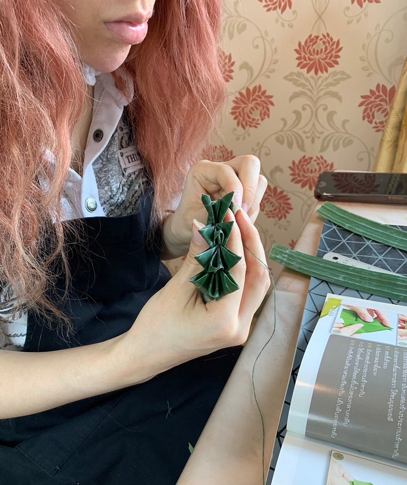และเรียนการพับกลีบแบบต่างๆ เพื่อใช้ในแต่ละส่วนของงานใบตอง กลีบหลัก กลีบประดับ และการเย็บปิดตะเข็บ